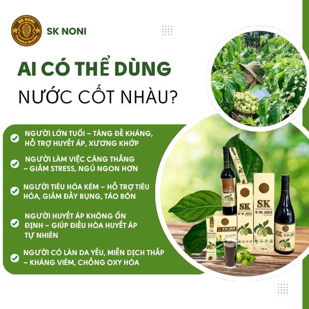 🌿 Nước Cốt Trái Nhàu SK NONI gói tiện lợi giúp BẢO VỆ SỨC KHOẺ, TĂNG ĐỀ KHÁNG, HỖ TRỢ ĐẸP DA chiết xuất từ trái nhàu MORINDA CITRIFOLIA, được trồng trong khu vườn quy hoạch riêng biệt và được kiểm soát chặt chẽ từ khâu gieo trồng, chăm sóc kỹ thuật; không phân bón hóa học, không dùng thuốc trừ sâu. Nước cốt nhàu thuần thiên nhiên với thành phần chứa hàm lượng cao các chất như: Mg, Ca, các acid amin, carotene, Vitamin C, Vitamin nhóm B, Fe, K, Na,… có tác dụng bổ sung dưỡng chất cần thiết, có lợi cho sức khỏe; hỗ trợ kéo dài tuổi thanh xuân.